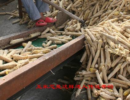 1. 將玉米芯外的包葉處理掉并放到傳送帶,玉米芯最好含有一定的水分,剛收下來的玉米芯可直接利用。干的玉米芯在攪拌中要添加少量水分。
