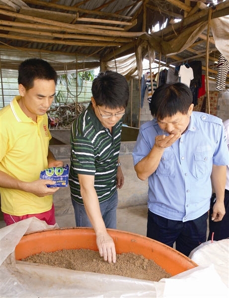 ④興業(yè)縣石南鎮(zhèn)馬塘村黃家亮(左一)采取自繁自養(yǎng)自配料模式養(yǎng)豬多年,去年開始在畜牧部門引導(dǎo)下從專業(yè)廠商購進益生菌種,添加進自制自配的飼料中發(fā)酵,從而不再使用抗生素、重金屬等。他手中的一袋500克菌種,可配制500公斤飼料,正好裝滿一大缸,常溫下發(fā)酵數(shù)天即可喂豬。