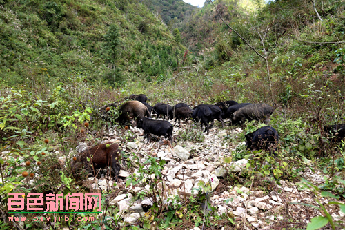 凌云縣朝里瑤族鄉蘭臺村茅坪屯村民李桂蓮在山里放養野豬令人稱奇。近日,筆者慕名前往離縣城60多公里的茅坪屯,探訪山林里的生態野豬倌。