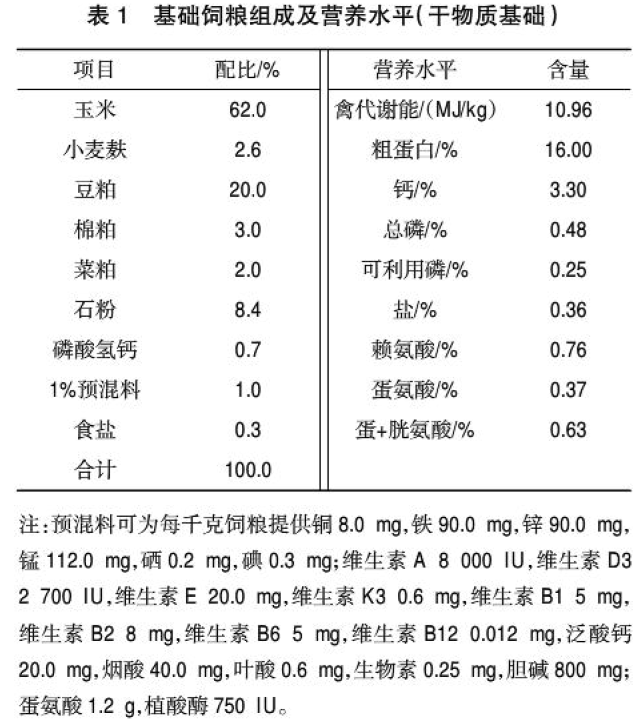 試驗雞斜坡籠養,每天飼喂2次,自由采食和飲水。試驗期間正常防疫,每天上午9:30撿蛋。晚上補光,恒定16h光照。預飼7d,正式試驗60d。試驗場地為某原種場示范養雞場。