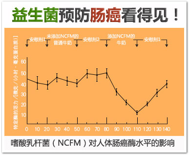 左圖為嗜酸乳桿菌(NCFM)對(duì)腸癌酶水平的抑制 該實(shí)驗(yàn)共進(jìn)了140天,過程中給予了三種不同的安慰劑、空白的牛奶和添加NCFM的牛奶,結(jié)果表明腸癌酶的活性只有在服用益生菌NCFM期間有明顯下降,并且在停服后出現(xiàn)反彈,其他任何階段,如服用三種安慰劑和未添加益生菌的牛奶,都沒有測(cè)試到腸癌酶水平的下降。