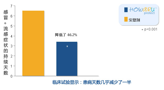 中國上海同濟醫學院厲曙光教授在浙江省金華市的某幼兒園針對3-5歲的兒童進行了一項臨床研究,結果顯示顯示HOWARU™ Protect的確能有效緩解發燒、咳嗽與流鼻涕等感冒癥狀。“它能使五歲以下兒童的患病天數減半,同時抗生素使用可減少達80%。”厲曙光教授表示。該實驗針對呼吸道感染所采用的隨機雙盲、安慰劑研究是遵照世界衛生組織的規定,研究對象涵蓋248名幼兒園兒童。在11月到次年5月、為期26周的時間中, 每日采用建議劑量的益生菌,借此觀察其對抗生素用藥及呼吸道感染癥狀所產生的影響。該研究進行的時程覆蓋了幼兒呼吸道最脆弱的秋冬季節。