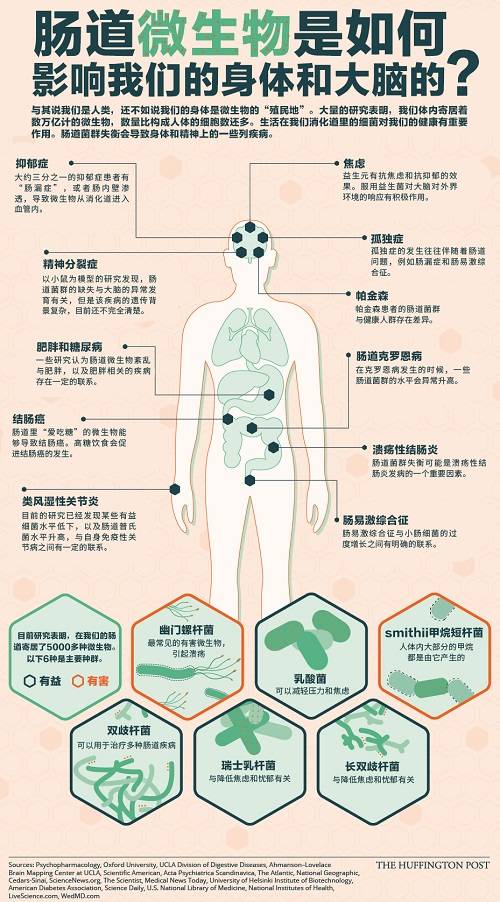 很多人也許不知道,我們每個(gè)人雖然看上去是獨(dú)立自主的,實(shí)際上卻是微生物的“殖民地”。大量研究表明,人體內(nèi)寄居著數(shù)萬億計(jì)的微生物,數(shù)量比構(gòu)成人體的細(xì)胞數(shù)還多,把它們放在一起大概有3斤重,跟我們的大腦相當(dāng)。實(shí)際上,這些微生物不只是體量跟大腦相當(dāng),它們的重要性也不可小覷。一直以來,它們都是被我們忽視的一個(gè)重要“器官”。直到今天,我們才認(rèn)識(shí)到生活在我們體內(nèi)的微生物就象體內(nèi)的其它器官一樣,對(duì)我們的健康具有重要作用。例如腸道菌群失衡會(huì)導(dǎo)致身體和精神上的一些疾病。